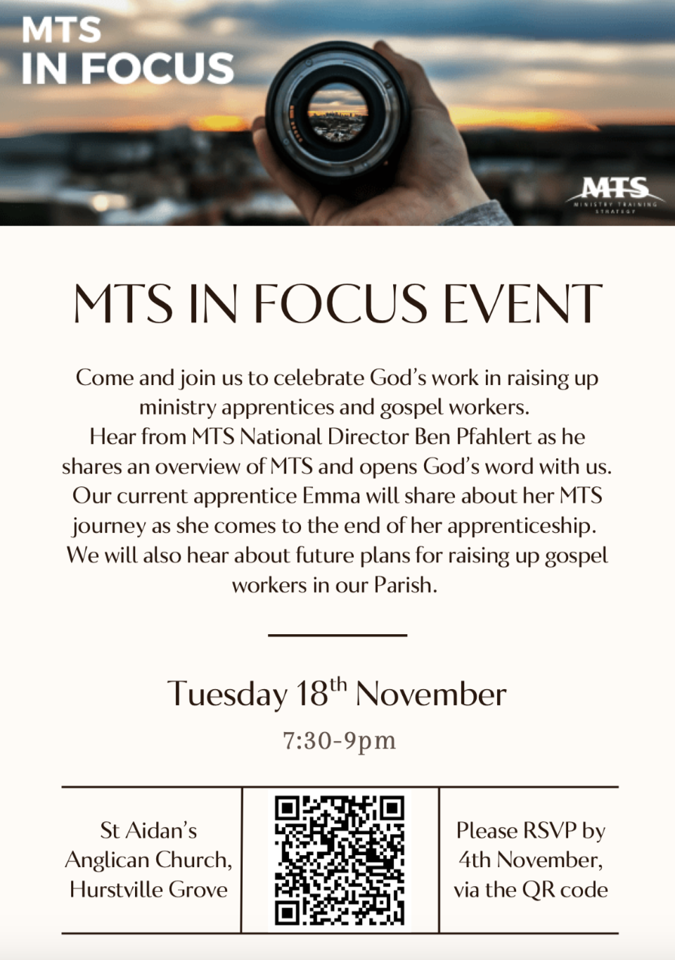 We will be hearing from MTS National Director Ben Pfahlert, and Emma Ball, St Aidan’s current ministry apprentice.