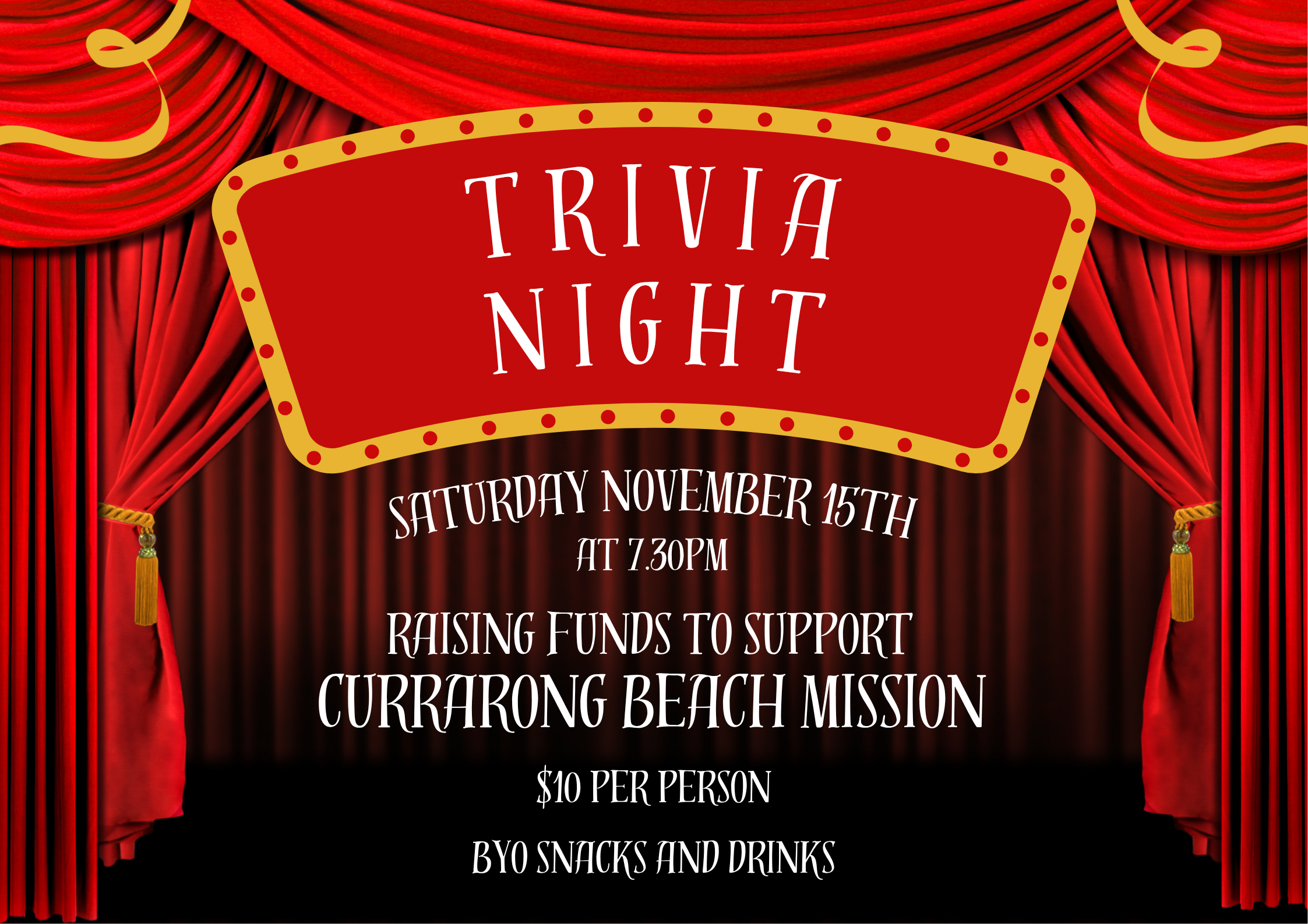 Join us for the SUFM Beach Mission Trivia Night, to raise money for Currarong Beach Mission. Tickets are $10 a head and can be paid on the night.